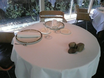 La mise de table est très simple, pas de choses qui alourdisse la table, du nappage blanc, des galets…