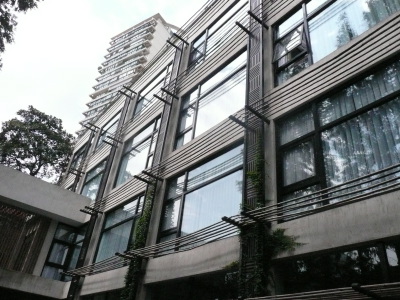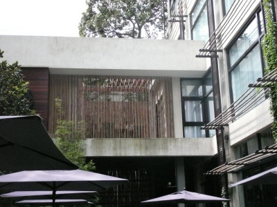 Le bâtiment, joue sur des formes très droites et rectilignes, un mélange de béton, de verre, de bois, de bambous, et de verdure.