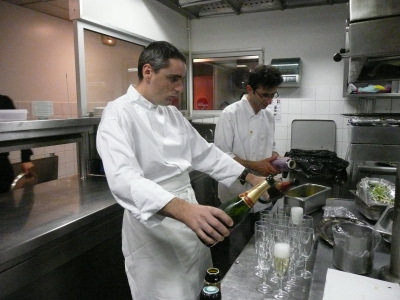 C’est en cuisine que le Chef Thierry Vaissière nous convias à trinquer ensemble…. le chef fit le service et même plus…. certains cuisiniers furent baptiser au Crémant…. Thierry tu n’est plus à Saint-Tropez, on est en cuisine pas sur la plage de Nikky Beach….