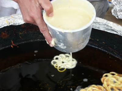 D'un entonnoir ils laissent couler une pâte, avec laquelle ils dessinent dans l'huile chaude une sorte de rosace