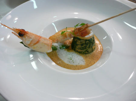 Royale d’oursins et langoustines, asperges vertes de Provence, émulsion de jus de carcasse.