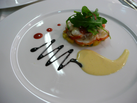 Salade de homard en carpaccio, tartare de fruits exotiques, vinaigrette coco/curry.