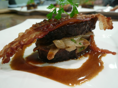 Présentation & finition : Découper transversalement les joues pour les présenter en millefeuille après les avoir parées. Intercaler le condiment d’oignons entre les tranches de bœuf et les réchauffer à feu doux avec un peu de sauce légèrement détendue. Dresser sur assiette plate, napper de sauce puis, disposer une chips de lard et décorer avec une pluche de persil plat.