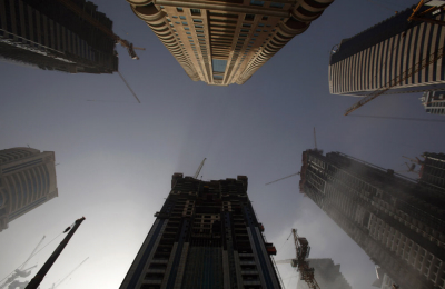 Les silhouettes d’immeubles au béton nu et les immenses grues immobiles se succèdent le long des autoroutes urbaines dans une ambiance d’apocalypse.