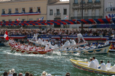 La Fête de la Saint Louis, c’est un peu la Féria de Nîmes ou de Béziers, enfin dans l’esprit, sans la tauromachie comme fil conducteur…. ici se sont les Joutes et la macaronade…. par contre la musique, les Bodégas et l’esprit de Fête restent les mêmes…. Le centre ville se transforme en foire populaire où chaque bar, chaque restaurant, chaque angle de rue est propice à une terrasse improvisé où résonne de gros sons !
