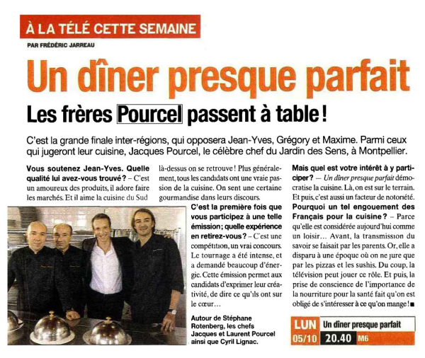 Dans Télé Magazine du 3 au 9 octobre, en attendant de nous retrouver lundi soir sur M6 pour la Finale Nationale de » Un dîner Presque Parfait « ……… à vos télécommandes….
