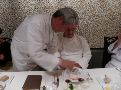 Râpage de truffes blanche d’Alba sur l’assiette des Chefs par Hiroyuki Hiramatsu….. normalement 6 lamelles par personne, c’est off, mais nous avons eu droit au moins à 8…… Séance émotion !