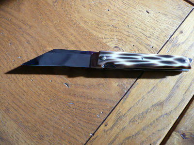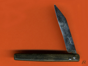 C’était un couteau rustique, dépourvu de ressort et de platine, la lame tournait autour d’un axe, un second clou était prévu dans le manche afin de servir de buttoir au niveau du talon.