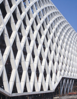 Comme l’acier n’évoque pas spontanément la sensualité, la résille a été revêtu d’un béton renforcé de fibres de verre (Glass Reinforced Concrete ou GRC) couleur pierre claire, une référence au château de Chambord autant qu’aux réalisations de l’ingénieur Eugène Freyssinet. L’exosquelette en acier assure de son côté, la reprise des efforts horizontaux par l’entremise de bielles métalliques.