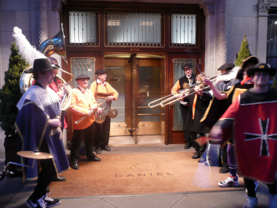 Dimanche soir, haie d’honneur devant le restaurant » Daniel « à New York, pour accueillir les 80 participants au dîner itinérant des Chefs, qui les mènera sur trois tables différentes tout au long de la soirée. Trois tables, trois étoiles, et sept grands chefs qui les attendent.