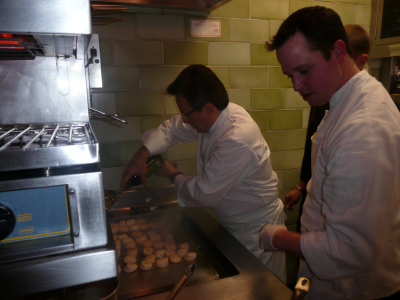 Daniel Boulud aux côtés de Benjamin Armstrong pour la cuisson des noix de Saint-Jacques du chef Pourcel.