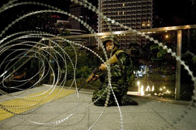 Soldat en embuscade et barbelés face au Dusit Thani (en fond de photo l’immeuble de l’hôtel).