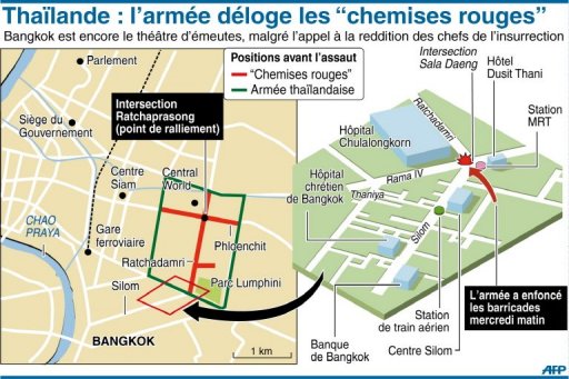 On peut constater sur ce plan que l’hôtel Dusit Thani se trouve face aux combats.