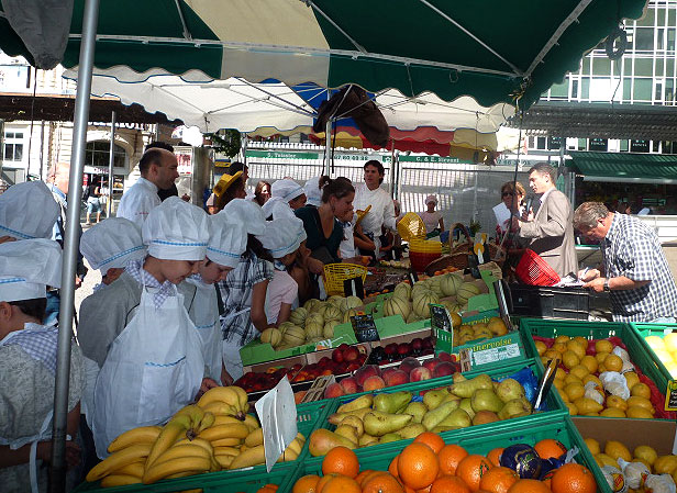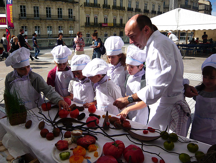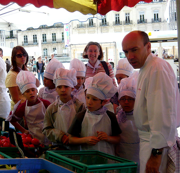 Dès 10h, les enfants de centres aérés de la ville ont revêtu leur costume de « petit chef », puis sont partis faire le marché avec les chefs, chaque chef ayant 20 enfants à initier.