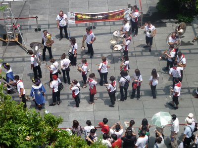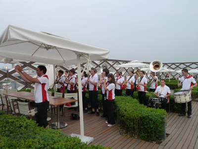 Et puis, bien sûr dans le patio du Pavillon France où le groupe se produit plusieurs fois par jour.