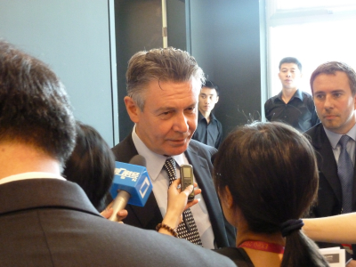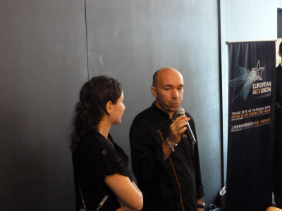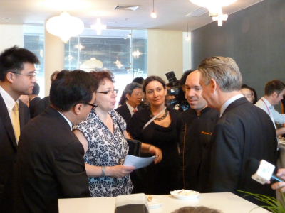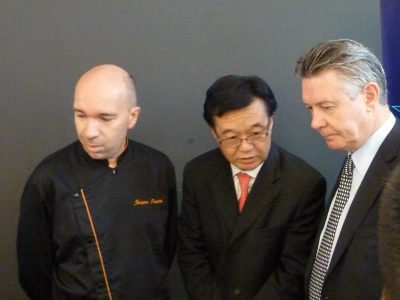 Ce jour-là, le » Pavillon Europe « recevait le belge Karel De Gucht, commissaire européen de la direction générale TRADE (commerce), Gao Hucheng, vice-ministre du commerce de la République Populaire de Chine et le Chef Jacques Pourcel. (ci-dessous)
