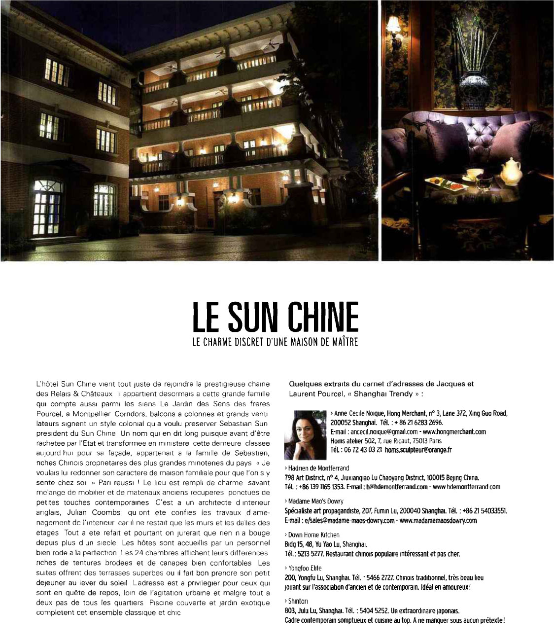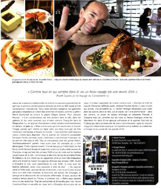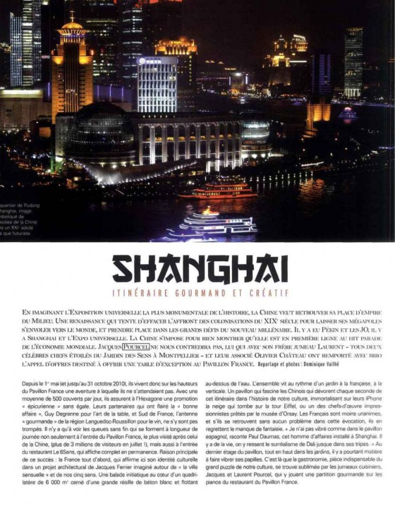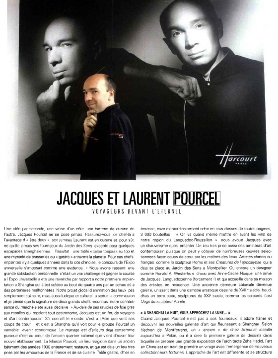 Le magazine tendance et chic » Balthazar « , sous la plume de la globe-trotteur Dominique Homs-Vailhé, consacre plusieurs pages à l’aventure chinoise des frères Pourcel à Shanghai. 4 pages qui font un état du » Shanghai des jumeaux cuisiniers » à l’occasion de l’Exposition universelle. Suivez les adresses de J. Pourcel pour un séjour sur place plus que réussi.