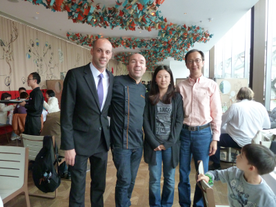 Yohan Valette, le directeur de 6Sens et le chef Jacques Pourcel en compagnie de Fu Ming Xia et son époux Anthony Leung, banquier célèbre à Hong Kong. Fu Ming Xia est une des personnalités les plus connues de Chine, une star, athlète 5 fois médaillée olympique, dont 4 médailles d’or, et 2 fois championne du monde… le tout dans la catégorie plongeon.