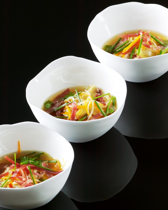Disposez au fond de chaque assiette creuse les trois ravioles, la julienne de légumes et la ciboulette. Versez le bouillon bien chaud à hauteur et terminez par un filet d’huile d’olive.