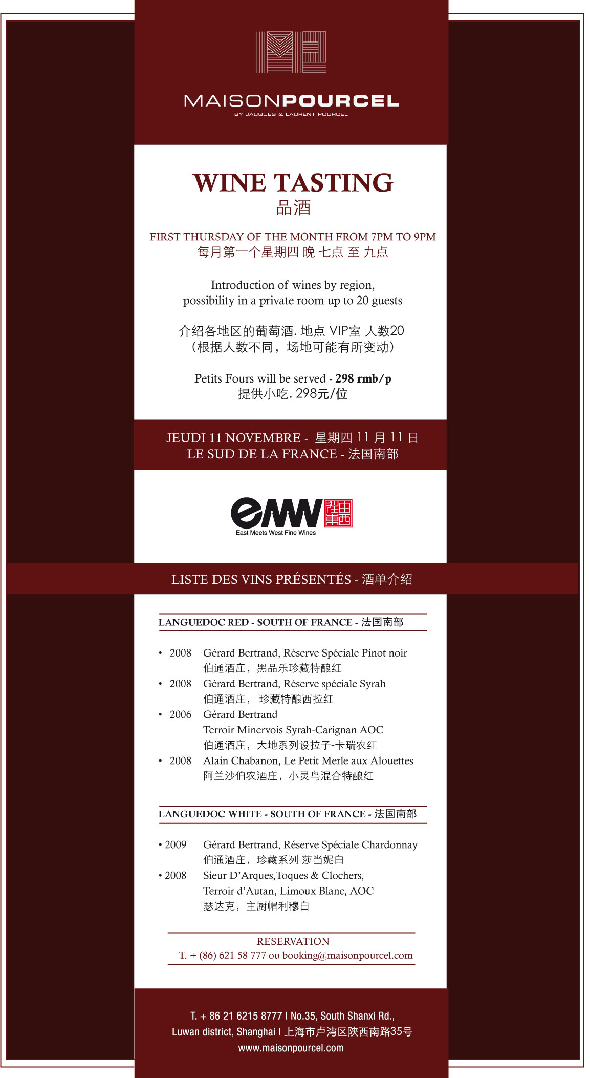 Les premières dégustations de vin auront lieu prochainement au restaurant Maison Pourcel à Shanghai, jeudi 11 novembre. C’est le Sud qui sera à l’honneur.
