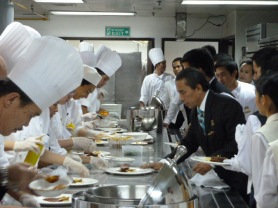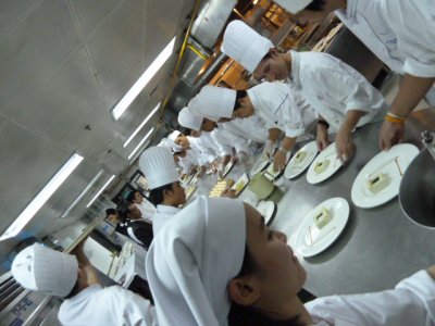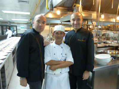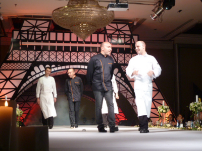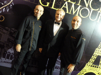 Pendant ce temps, tout le monde s’activait en cuisine pour servir le dîner. Les deux frères étaient mobilisés, un avec le chef Philippe keller pour envoyer le banquet, et l’autre avec le chef Julien Lavigne au restaurant des frères Pourcel D’Sens, au dernier étage de l’hôtel Dusit Thani qui affichait complet. Yannis Khérachi, le sommelier du Jardin des Sens avait pour charge de s’occuper des tables VIP du dîner » French Glamour « .