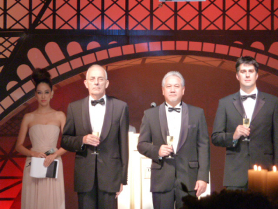 L’hôtel Dusit Thani recevait dans son Ballroom les convives autour d’un podium surmonté d’une énorme tour Eiffel, les trois invités d’honneur, le Président de la Chambre de Commerce Franco-Thaïe, Franck Fougere, le Ministre thaïlandais et l’Ambassadeur de France, M. Gildas Le Lidec qui firent remarquer à quel point ils étaient émus d’être présents et de prononcer leurs discours sous la tour Eiffel.
