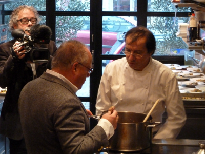 Ce n’était pas vraiment une surprise de le retrouver dans les cuisines du célèbre restaurant Le Garage où il préparait un menu esprit » Brasserie parisienne » pour une bonne centaine de personnes ce dimanche au déjeuner… Sardines en escabèche – Salade de gésiers confits, magret fumé et copeaux de foie gras – Andouillettes de Alain Bernard et salade de lentilles – Cabillaud à l’encre – Gigot d’agneau aux haricots blancs et courgettes – Poire et vacherin mont d’Or – Île flottante –