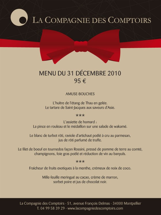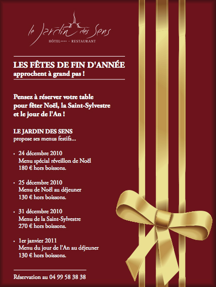 Pensez à réserver votre table pour les fêtes de fin d’année. Maison Pourcel vous reçoit pour ses premiers réveillons de fin d’année. Découvrez le menu des fêtes créé par les frères Pourcel. Pour les réveillons de Noël et de la Saint-Sylvestre, champagne et gastronomie au programme, quoi de meilleur pour entreprendre une nouvelle année qui démarre ? Foie gras, truffes, noix de Saint-Jacques, huîtres françaises et saumon fumé entre autres seront de la fête. Dès à présent, les frères Pourcel vous invitent à découvrir le menu des festivités et vous souhaitent une belle fin d’année 2010.