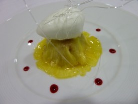 La raviole d’ananas aux framboises, sorbet verveine & le Mont-Blanc marron chocolat blanc.