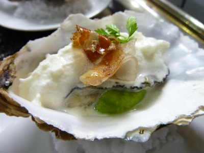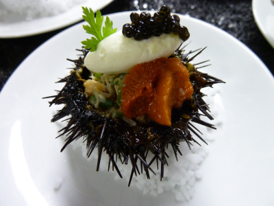 L’oursin au caviar et tourteau & l’huître de Marennes chaude aux petits pois, émulsion au lard.