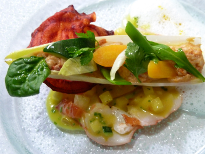 La salade de homard en feuilles de batavia croquante, vinaigrette épices et petits légumes.