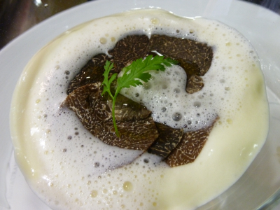 Le jaune d’œuf coque en mousseline de pommes de terre, émincé de truffe du pays.