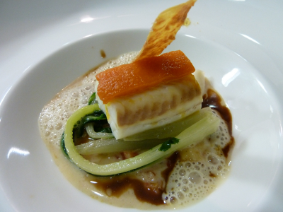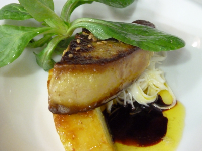 L’escalope de foie gras de canard poêlée, mangue verte poêlée minute, sirop de Banyuls, râpé de céleri.