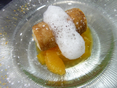 La fraîcheur de clémentines, tube praliné, lait à la vanille.