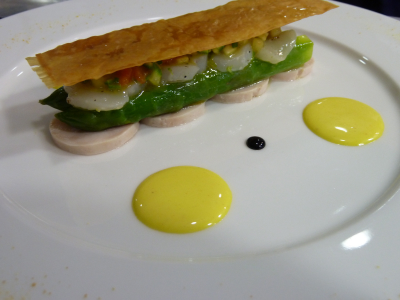 noix de Saint-Jacques marinées et vinaigrette croquante, façon mille-feuilles.