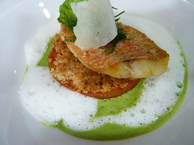 Le filet de rouget grillé minute, crumble de tomate et aubergine au pain,