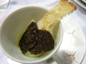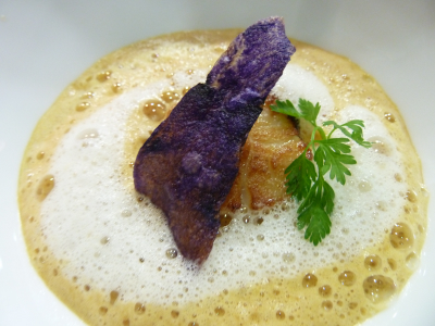 cassolette de crosnes et châtaignes, bouillon comme une bisque.