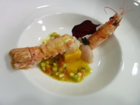 et rôti sur un cube de mangue verte, vinaigrette croquante.