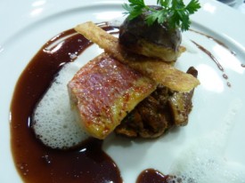 Le filet de rouget grillé, jeunes girolles, rôti de foie gras,