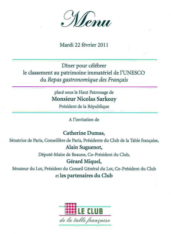 Ce dîner fut l’occasion de célébrer le succès du « Repas gastronomique des Français » inscrit au patrimoine culturel immatériel de l’UNESCO.