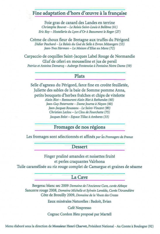 Le menu élaboré sous la direction de Monsieur Henri Charvet et préparé par les chefs Euro-Toques, entourés des élèves de l’Ecole Ferrandi, a fait honneur aux nombreux invités dont les papilles ont voyagé à travers les régions de France.