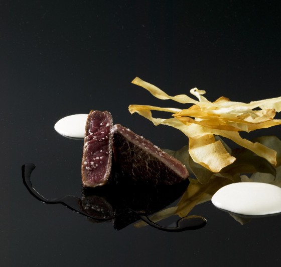 Pièce de filet de bœuf rôtie, jus au vin de passion, émulsion de pommes de terre, chips de panais