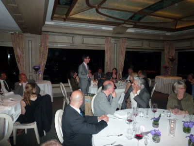 Intervention du chef Jacques Chibois qui représente les Grands Chefs R&C au sein de la délégation a salué au nom de tous le talent du chef de La Chèvre d’Or. On reconnaît sur la photo, à table, les chefs Jean-André Charial, Xavier Mathieu.