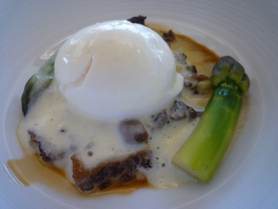 Les séances de travail pour les propriétaires et chefs des établissements Relais & Châteaux n’ont pas empêché de prendre des moments de plaisir à la table de La Chèvre d’Or, avec notamment ce remarquable œuf mollet aux asperges.