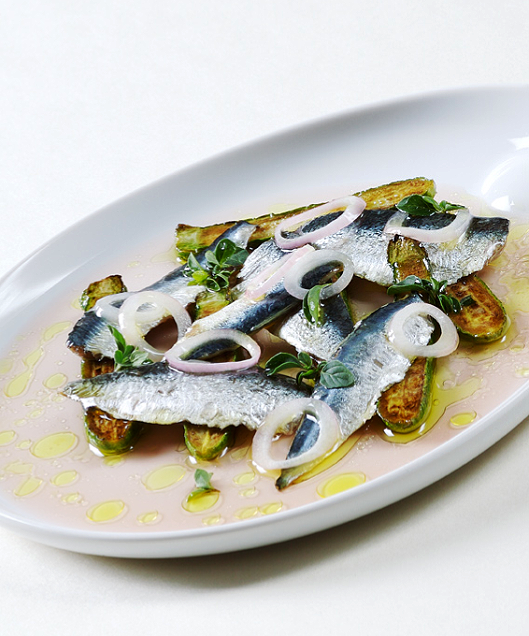 La recette de la semaine : Escabèche de courgettes à la marjolaine et sardines marinées à cru