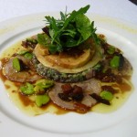 – Le carpaccio de jarret de veau, salade de lentilles aux herbes, fine tartelette de foie gras poêlé, vinaigrette aux févettes et condiments.