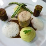 – La pintade : la cuisse confite en civet en croûte de pistache, le filet poché, fine purée de pommes de terre, asperges grillées, jus de pintade aux morilles.
