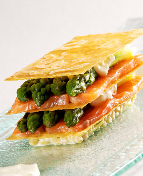 Mille-feuille d’asperges vertes, fine escalope de saumon, crème légère aux échalotes confites