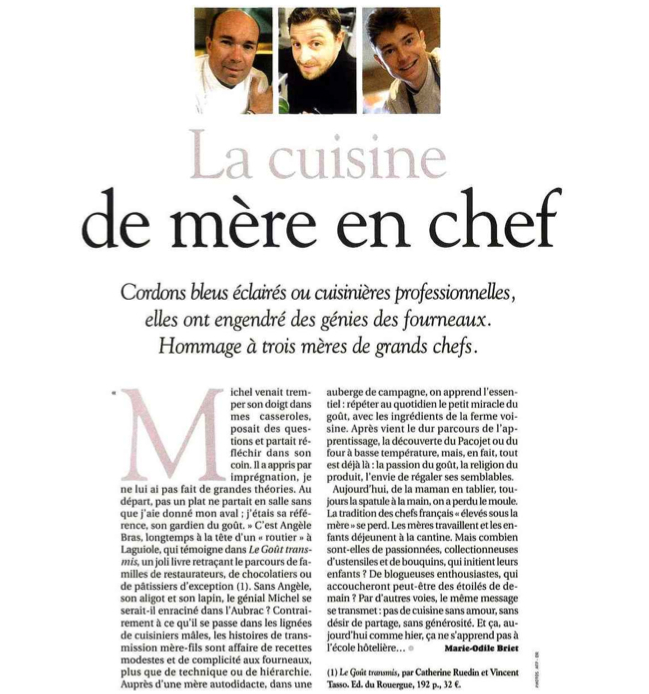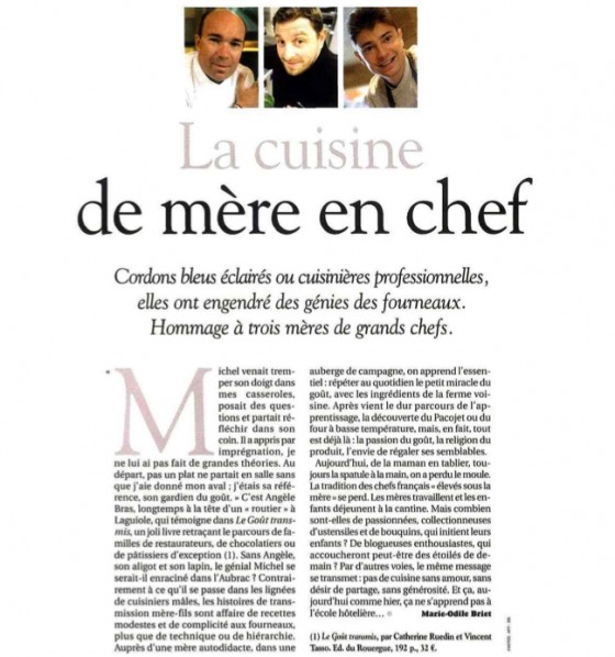 Retrouvez » L’Express Style » de cette semaine en cours avec un article dédié aux » Mamans de Chefs « … Celles qui » ont engendré des génies des fourneaux » sous-titrait le magazine. Hommage à trois mères de grands chefs ! En tout cas un bel hommage à la Maman des jumeaux Pourcel trop tôt disparue.