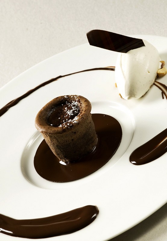 Faites fondre le chocolat au bain-marie. Coulez des disques sur du papier sulfurisé et laissez refroidir. Dressez les soucoupes de chocolat au fond des assiettes, disposez un gâteau fondant et cernez de sauce chocolat. Accompagnez d’une quenelle de glace à la vanille.